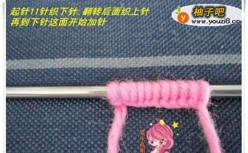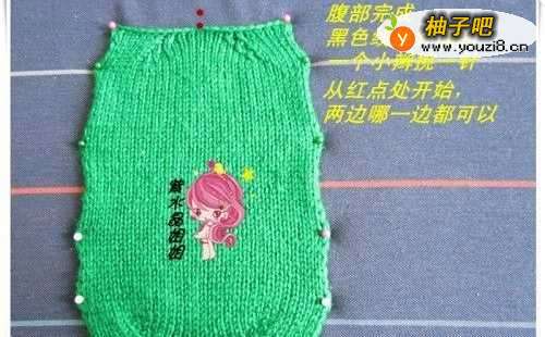 5腹部。大约需一两线。能换一种颜色,也可不换,看您怎样搭配好了。起33针,织平针,舍棍改分别从两边数6针处开始加针,隔一行两边分别加2针,直到把33针全织齐时,不加针不减针再织56行,其实就是织到两侧各有28个小辫时即可,开始减针,和起头时对称,隔一行两边分别减2针,减到剩21针时收边,腹部就完成了。