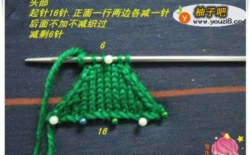 8头:起16针,来回织平针,隔一行两边各减1针,剩8针时,开始加针,顺着原来减针的小辫挑,速度一样,16针全织齐时,把起头时的16针一起挑起,共32针,转圈织,与我们小时候织袜子的办法以一样,织四五圈后开始减针,只在一面减,通常选挑针的一面,让它作为头披耻的下面,隔一圈减2针,分别从16针的两边减,这样能保持头部的上面光滑好看,减到总针数22针时,不再加减,织一寸,再把头下方缝合处织成弯月状,收边即可。