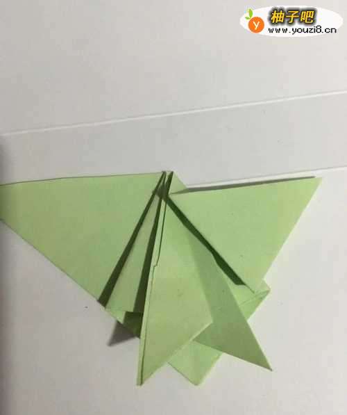 7第七步 两边的两只前脚都折好之后 再折叠头部 先向下折叠再向上翻折 然后再折小乌龟的壳 把两边的尖角折进背面 最后整理一下 一只可爱的小乌龟就折叠完成了