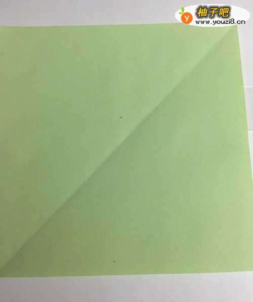 第一步 把一张16厘米X16厘米的正方形红色彩纸 先从下向上对边折叠出两条对边线 然后再折叠出两条对角线