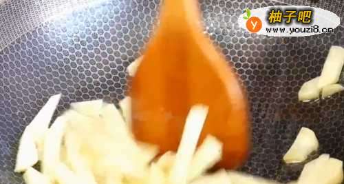 55.锅内在添加少许油,下入姜丝爆锅,再下入蒜薹煸炒,将蒜薹炒至稍变软,至断生,加入盐翻炒均匀,蒜薹不宜炒制的过烂,以免辣素被破坏,杀菌作用降低。
