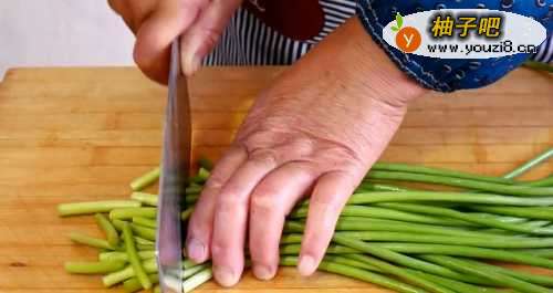 1.准备好所需材料,蒜薹择洗干净,把蒜薹切成3厘米左右长的段。