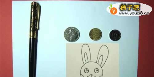 在画简笔画时,圆形比较难画,这可以用一枚硬币来画个圆,这样在圆基本形状上进行添加线条或图形就可以画出很多好看的图形了。这里给大家分享用硬币画简笔画,一个调皮的小白兔,大家也来画画吧