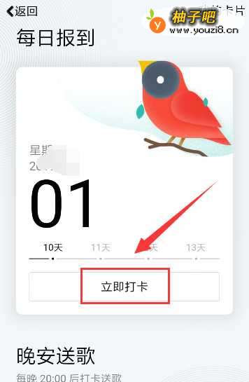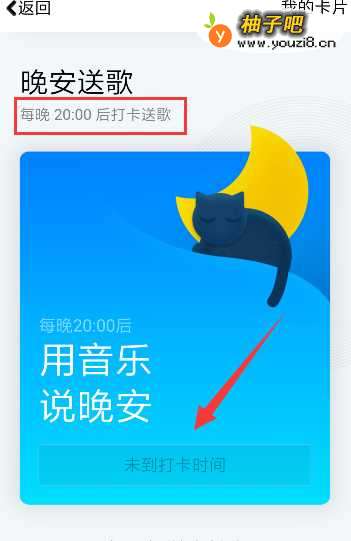 6另外,你也可以设置晚安送歌,每晚20:00后,可以打卡,如图所示