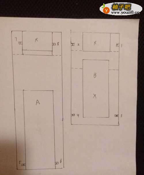 2按照自己想好的思路使用铅笔,尺子分别画好A,B两块纸板的图形结构图,方便裁剪,如图: