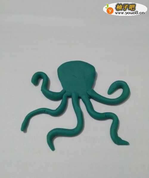 5再搓三个细长条,都弯几道弯,粘在章鱼身体下面,均匀散开粘好。