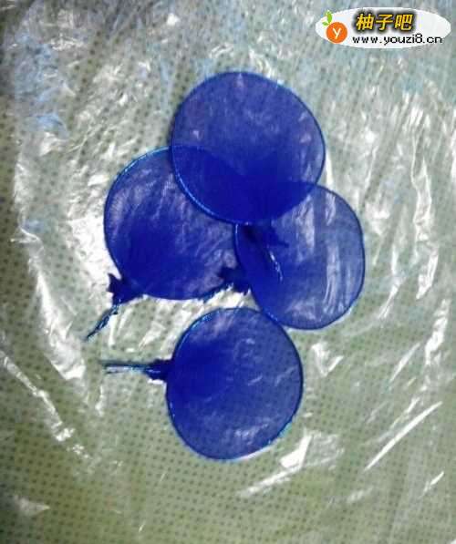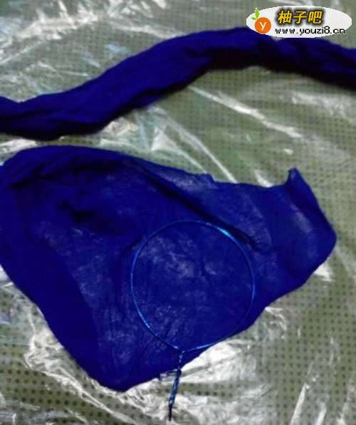 2找到蓝色的有弹性的丝网,套在第一步做的铁环上,不要太紧也不要太松,尾端不要留太多的丝网,用剪刀剪掉。