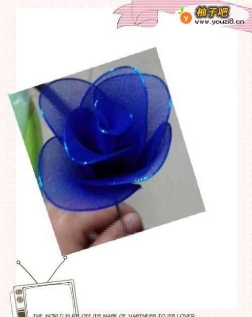 4拿出一根花杆,缠上一层绿色胶带(防止脱落),把花瓣用弹力线绑上去分为三层,第一层有5片,第二层3片,第三层2片,里面可以用丝网缠住(防止铁丝扎破丝网)。