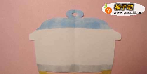 6最后,用蓝色的马克笔,在剪出的汤锅的锅盖图形上,涂颜色,注意颜色要涂均匀,并用灰色和橙色的马克笔给汤锅的底座图形涂上颜色,这样一个好看的汤锅图形剪纸手工就制作好了,如下图所示。