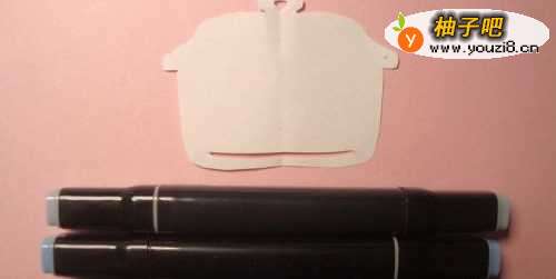 5然后,把汤锅图形的剪纸展平,摆放在桌子上,并选择蓝色和灰色的马克笔,准备涂上颜色,如下图所示。