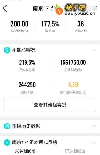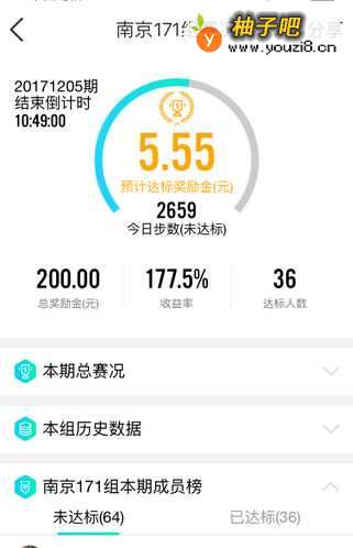 5我的是”南京171组赛况“,此页面的内容较多,首先看到的是比赛的概况:预计达到的金额5.55元,今日走的步数2659步,本组总奖励金200元,目前的收益率是177.5%,目前的达标人数是36人。再下面就是”本期总赛况“、”本组历史数据“和”本组本期成员榜“