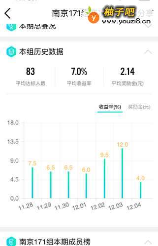 7点击”本组历史数据“,可以查看你所参加的小组历史数据,内容包括:平均达标人数、平均收益率和平均奖励金。下方用柱形图表的形式表述了近一周本组的收益率和奖励金情况。