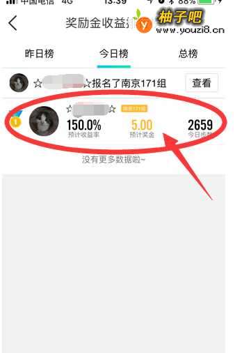 4采用第二种方法,首先进入的是”奖励金收益排行榜“页面,这里介绍的是今日你和你的朋友的参赛情况,会自动排出名次。哈哈,我这里朋友中只有我一个人参加了今日的比赛。点击红圈标注位置即可进入今日比赛情况。