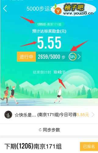 3进入“当日赛况”页面有两种方式,第一种就是点击“QQ5000步运动奖金赛页面”预计达标奖励金数字下方的”进行中 2659/5000步 53% >“进入。第二种就是点击首屏中间位置,有个小头像,后面是QQ名“(南京171组)今日可得5.55元”位置点击进入。如下方箭头位置。