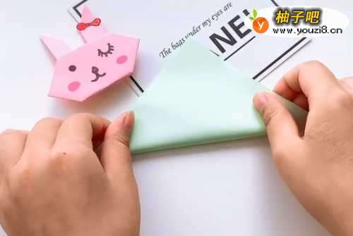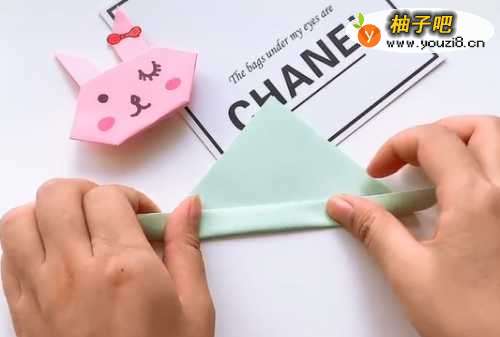 5翻转,转到兔子脸的正面。把头顶部分往后进行折叠。