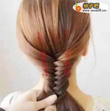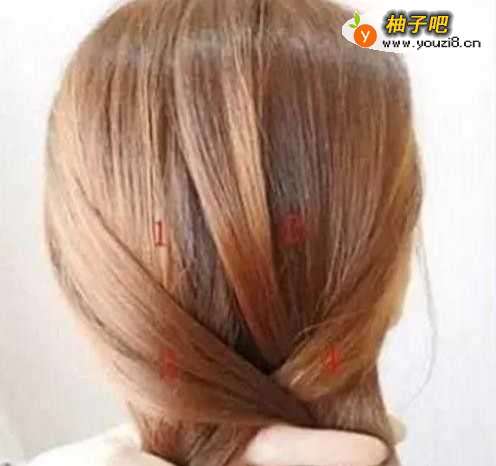4再从1、2外侧各取一小股头发5、6,同样是在上方交叉再置于1、2下方,后面也是重复这样的动作;