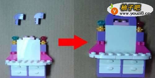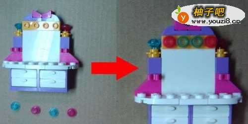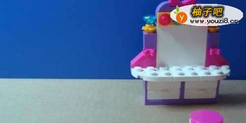 5然后拼装柜台的椅子部分。由两个零件积木所组成。拼装好了把化妆柜摆放好,位置。如下图所示。