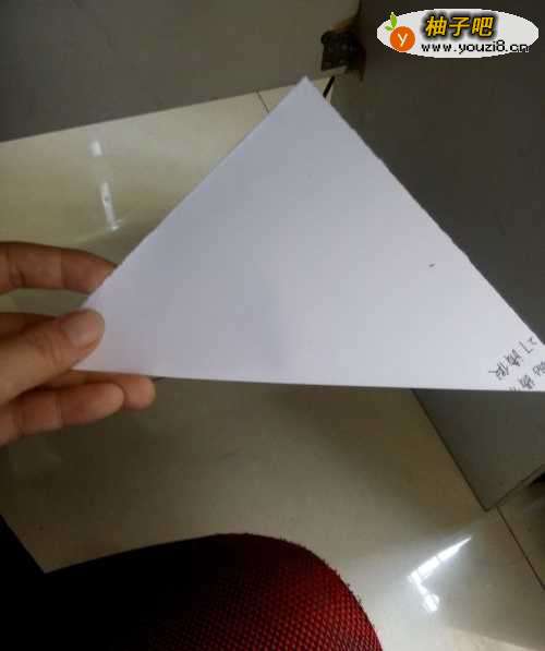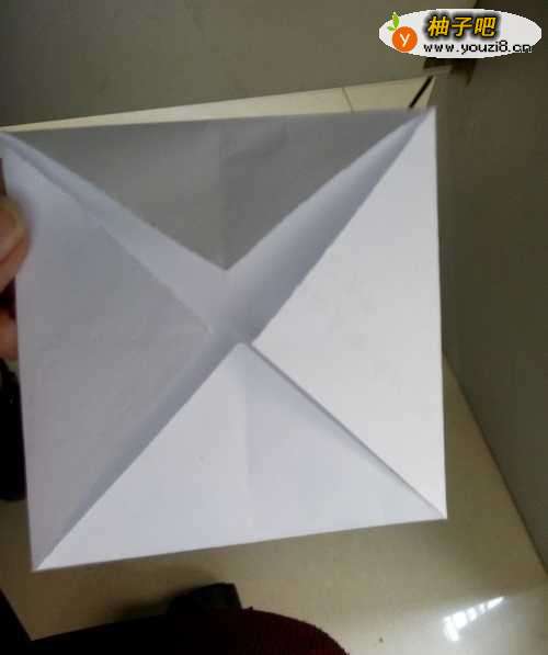 将方形纸张进行对角线对折。展开之后,另外一个对角线按照相同的方式操作。
