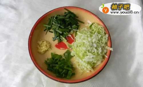 2圆白菜切丝,韭菜切段,小葱切碎,姜切末。圆白菜我用了小半颗,大约200g,韭菜没称量用了6根。小葱和姜就是平常炒菜的量。