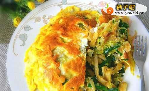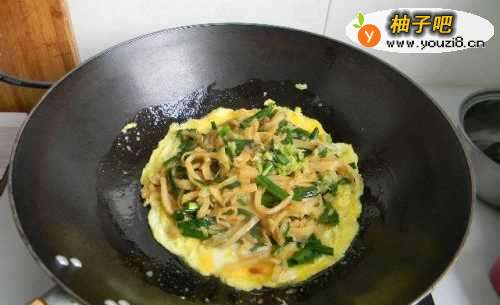 14鸡蛋液上面还没有凝固时,将炒好的饼丝放在没有凝固的蛋液上,让蛋液和饼丝粘在一起。16.可以小火多烘一会儿,这样非常好吃,但要用时晃动炒锅,可以在鸡蛋饼的一圈淋上少许油,防止鸡蛋粘锅底。