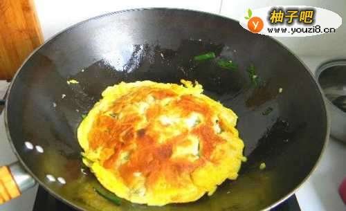 13炒锅在放少许油,倒入打散的蛋液。摊成大饼。