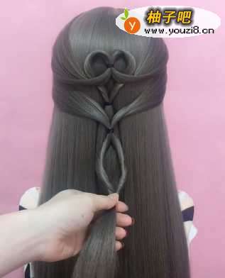 4再把缠绕两圈的头发往上翻,然后在最上面那两缕头发中间的洞里面穿过去,然后把皮筋下面的散头发拽下来,这样第一个心形就弄好了