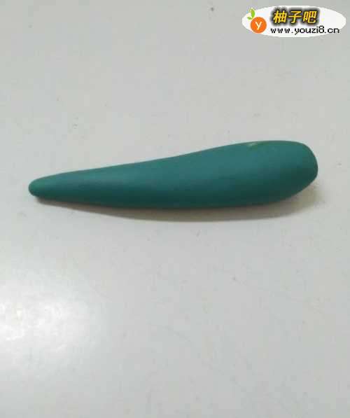 2先将蓝色的彩泥搓成一个一头尖一头圆的长条。