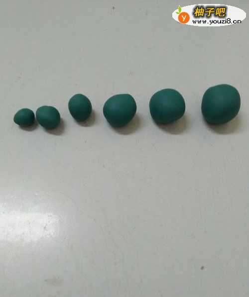 3将蓝色长条分成大小不同的几段,再用手揉成圆圆的小球。