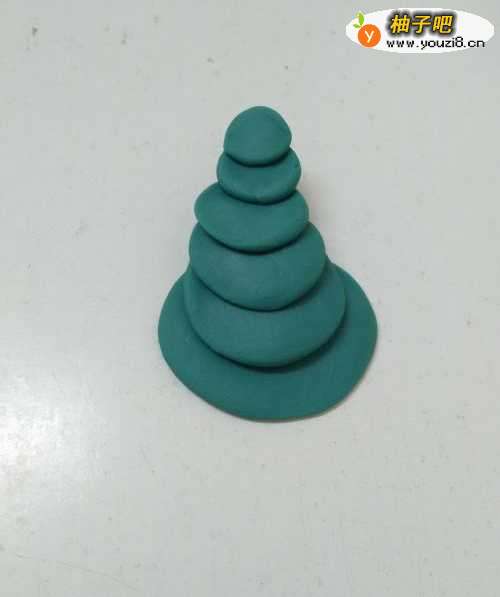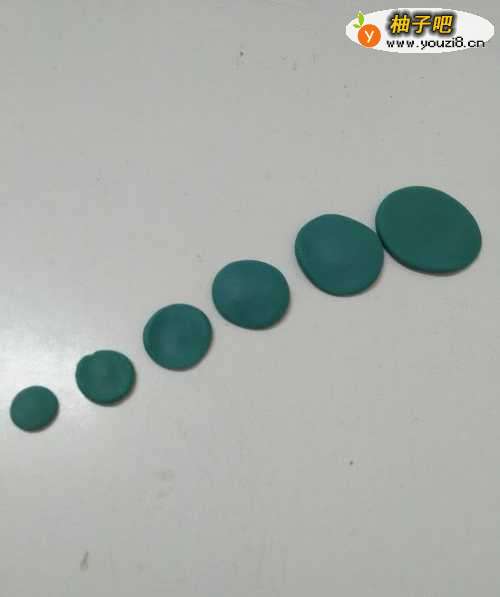 4将每一个小圆球在桌上按成圆圆的扁片,一个比一个大,按顺序摆好。