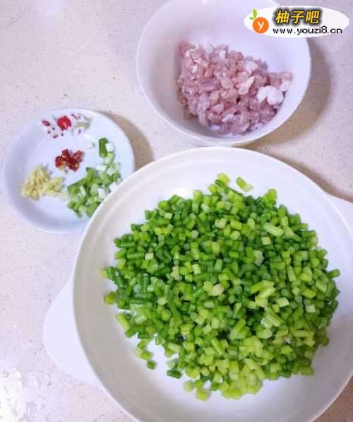 将蒜苗洗净切成丁,~ 姜、葱白、小辣椒切末
