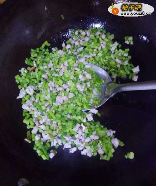 4倒入蒜苗丁,一起翻炒,炒匀加入盐,生抽(调味)、生抽(上色)加一丝水炒匀收汁即可