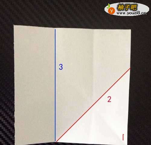 3分成三等份之后,将1所示的三角形区域,沿着2所示的红色斜线,折到3所示的蓝色线那里,将边角线对齐。