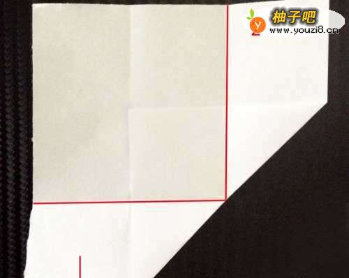 8将折好的形状,翻转到另一面,沿着下图红线所示的地方,往下折一下,要折紧一点。