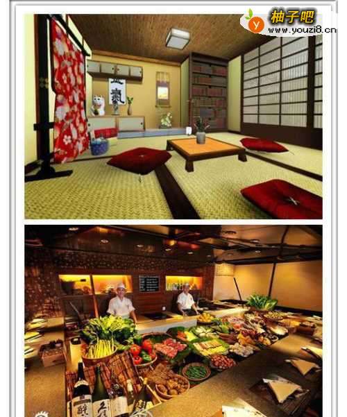 餐厅:一般日、本居民的住所,客厅、饭厅等对外部分是使用沙发、椅子等现代家具的洋室,卧室等对内部分则是使用榻榻米、灰砂墙、杉板、糊纸格子拉门等传统家具的和室。和洋并用的生活方式为绝大多数人所接受,而全西式或全和式都很少见。