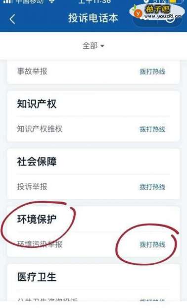 7找到环境保护,选择环境污染举报后方的拨打热线。