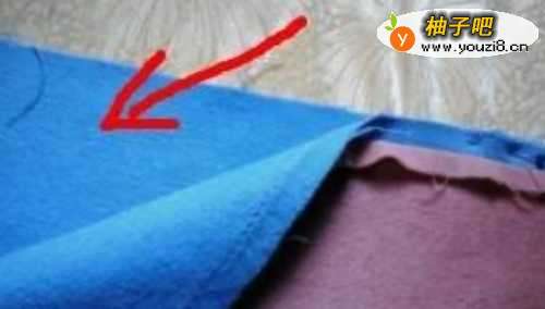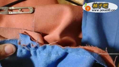 7准备两片衣片的缝合。箭头所指是没有经过剥开布边的一片,两片衣片缝合时只需其中一片剥开布边处理。正面蓝色对齐布边,准备缝合
