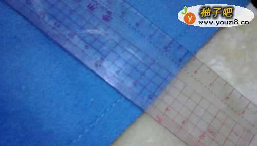 8蓝色布边是1.2cm宽,中间车缝一道线,这条线颜色必须和正面蓝色一致,针距调整短些。车缝线上方黄色“1”宽度略小于“2”。车缝好后,修剪缝合的布边,让“2”的宽度略小于“1”.前面14时,是“2”部位要宽些,是因为缝合过程不可能缝合的那么整齐,留宽些,可以最修剪用。