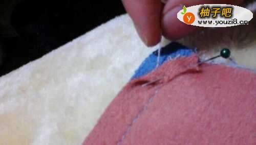 103”如图烫平后,把3的边折进去,用珠针固定,还是用藏针法缝合,这样两片衣片就可以缝合在一起了,并拆掉“3”上方的缝纫线。暗袋。