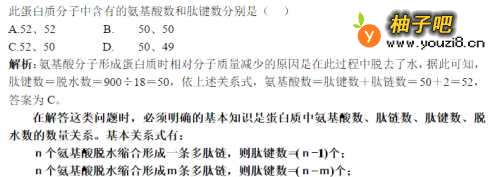 3根据相关知识将信息代入计算。关键信息:相对分子质量减少了900 相对分子质量为什么会减少?那是因为氨基酸形成肽链是要经过脱水缩合的,就是会形成水。而脱水数=肽键数,氨基酸个数=肽键数+肽链数。这样我们就能解决问题了。900/18=50(18为水的相对分子质量) 氨基酸个数=50+2=52 这样就可以确认选择 C 了。