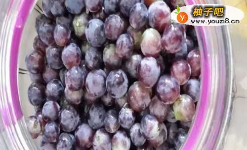 第四步,装入容器。把葡萄摘下来直接放进玻璃容器。除去枝梗,大概装置在容器80%高度。