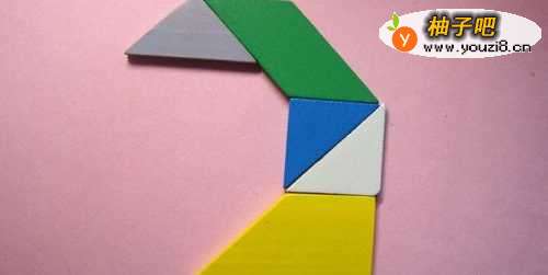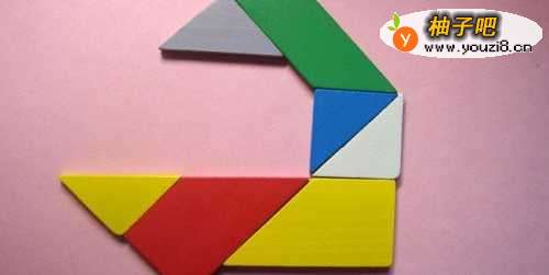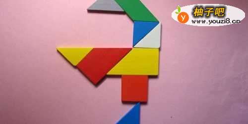 6最后,取蓝色的三角形板与红色的正方形板连接,并摆放在橘色梯形板的下边,拼接位置,如下图所示。这样好看的仙鹤图形就拼好了。可以让孩子仔细看一遍后,自己动手拼图,并不断回忆拼图的顺序,这可以锻炼孩子的记忆能力。培养孩子的过目不忘的能力,对孩子以后的学习有帮助。