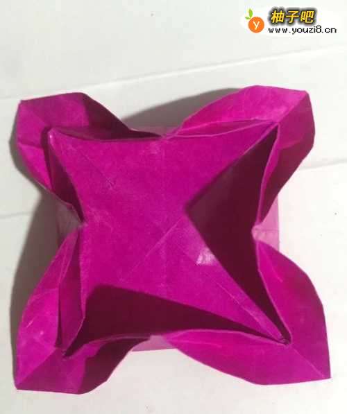 7第七步 四个角都向里折叠的同时 四个花瓣就形成了 然后压下每一个花瓣中的折痕 调整一下每个花瓣的大小 每一组的对称 最后掀起来背面的四片单页三角就OK了
