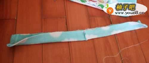 6再取一块布片,依然是正面对正面,缝合,另外注意到头的时候,回几针,防止开线