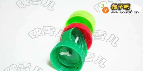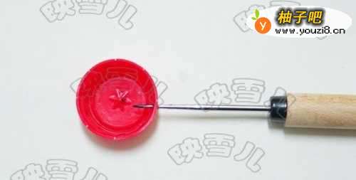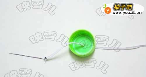 4用针线将皮筋穿过瓶盖。在末端打个结固定。