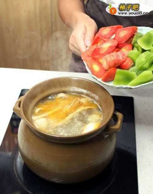 2加水煮沸,换入瓦罐。加入百合、芡实、沙参、山药、玫瑰盐,炖一个半小时,将药材和食材的味道与精华在小火慢炖中融合入汤料中。