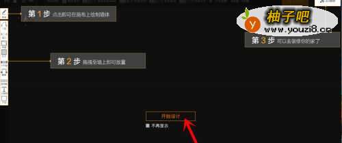 2点击开始设计,进行2D户型绘制。可进行自由绘图也可导入户型图进行临摹,工具栏中有画墙工具、门、窗等各项工具,比例尺寸在界面右边进行调整或手动输入。