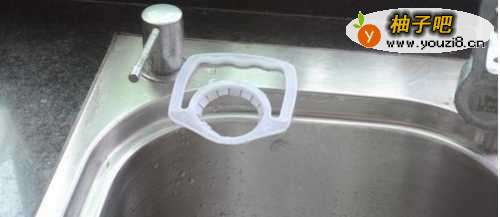 食用油桶不但桶身有很大的用途,常常被我们忽略的提手也可以改造后挂在厨房水池边,用来盛放洗碗用的抹布之类。