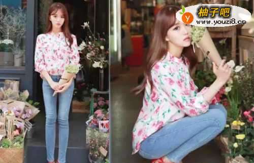一件花纹衬衫足够惹眼,下搭紧身牛仔裤修腿,露出裤腰边显得时尚精神气,脚穿红色粗跟鞋,色调鲜明奔放,映衬着衬衫花纹,看起来十分艳丽美。