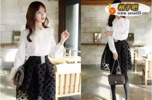 4一件白色雪纺衬衫,领口系白色丝带装饰出纯洁美,下搭黑色褶摆裙,裙身套透明圆点纱设计,下穿高跟鞋套黑丝袜,显得神秘性感,又不失女人韵味。