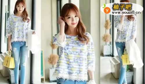3一件蕾丝边印花T恤衫,足够美丽惹眼,下搭紧身牛仔裤,裤身破洞设计显得粗犷时尚,脚穿白色高跟鞋显高挑腿长。